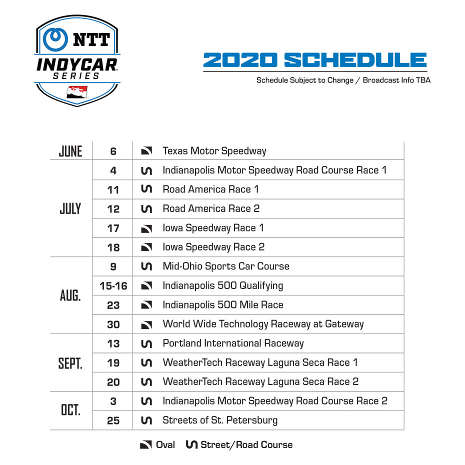 An updated 2020 NTT INDYCAR SERIES schedule was released today, displaying calendar adjustments implemented due to the COVID-19 pandemic.