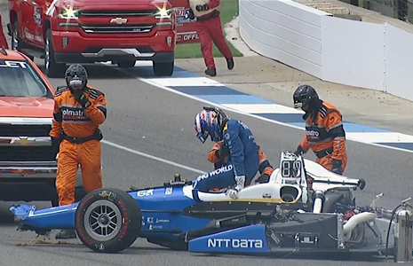 The damage to Dixon's car was catastrophic: pretty much everything behind the driver was gone, the front wing had been ripped off, only the left front wheel remained, and the right sidepod was gone. Oddly, the right-side mirror survived the ordeal. The Dallara chassis' safety cell that protects the driver did its job and Dixon was able to get out unaided and head to the track’s IU Health Emergency Medical Center, where he checked out fine.